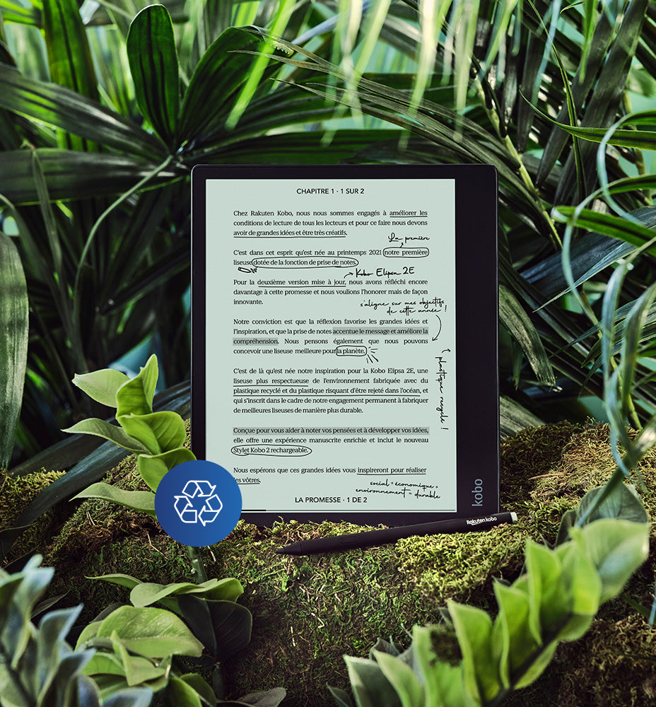 Dans le cadre de notre engagement à fabriquer des liseuses Kobo avec des matériaux durables, la Kobo Elipsa 2E est fabriquée avec du plastique recyclé et du plastique destiné à être jeté dans l’océan, ainsi qu’avec un alliage de magnésium recyclé. Son emballage est également plus durable. En savoir plus sur kobo.com/eco